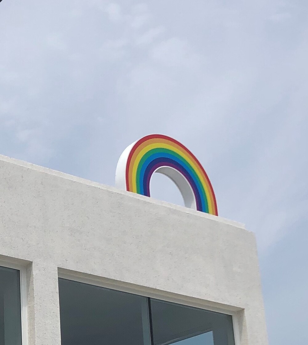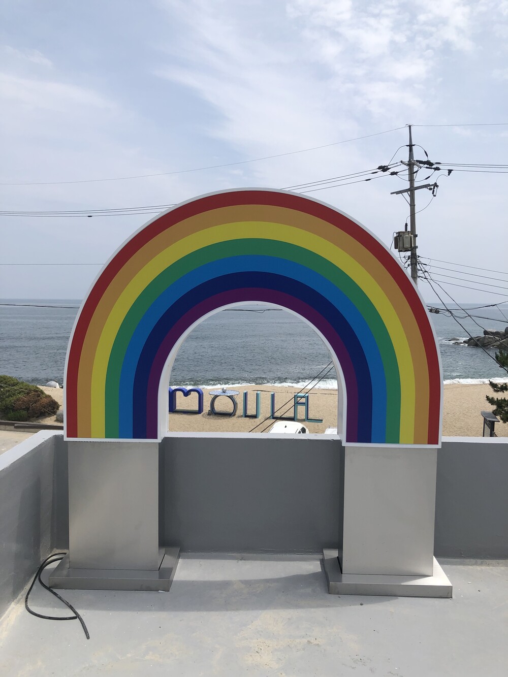 강릉 카페 옥상 무지개 채널 조명 금속 포토존 조형물