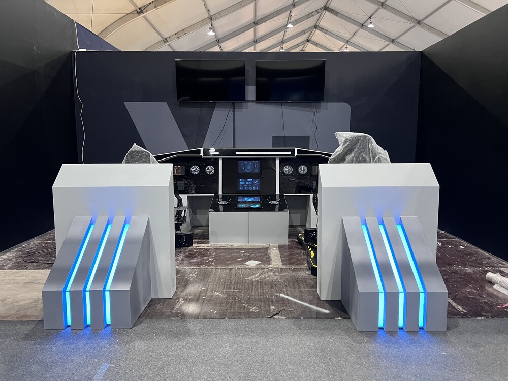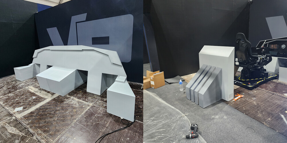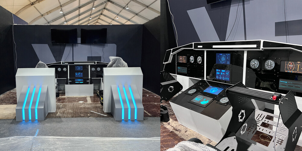 운송이 완료된 전시 하우징 조형물은 VR 체험에 사용되는 기기를 주변으로 결합 및 설치를 진행해 주었습니다. 이번 실내 VR 조형물은 미래지향적인 컨셉으로 제작되었으며, 의자 후면부에는 아크릴과 LED 조명을 사용하여 표현해 주었습니다. 대형 하우징 조형물과 조명이 함께 설치될 때에는 주변에 전기 연결이 가능한지, 사람들이 지나가면서 다치지 않도록 전선 위치 등을 고려하여 설치를 진행했습니다. 잠수함 조형물의 전면에는 실제 잠수함에서 운전하는 것처럼 연출하기 위해 잠수함 조종석의 화면을 표현해 주었습니다. 또한 아크릴, 기성 버튼 등의 디테일한 부분을 표현하여 현장감을 더 높여주었습니다.