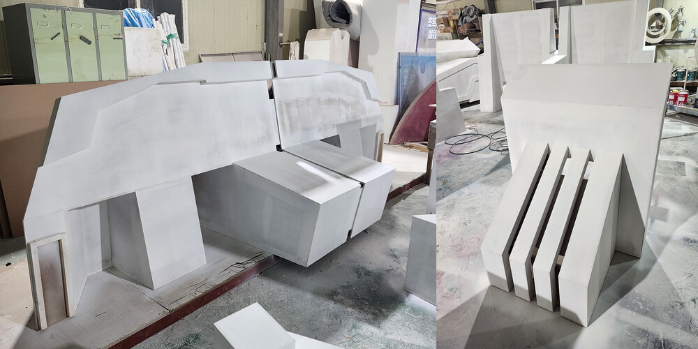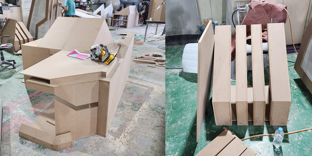 제작도면을 토대로 전시 조형물 제작을 진행하였습니다. 가로 4600미리의 대형 사이즈인 만큼 현장에서 작업이 필요하기 때문에 설계 도면에 따라 최소한으로 분할하여 작업을 진행하였습니다. 절단을 진행할 때에는 목재용 절단기를 사용하여 엑스포 전시 조형물의 절단면이 깔끔하게 제작될 수 있도록 해주었습니다. MDF, 목재 등은 습도, 온도 등의 영향을 많이 받는 소재로 단기 행사나 전시용으로 사용하실 때 추천드리고 있습니다. FRP나 금속 등에 비해 비교적 빠르게 제작이 가능하며, 단순한 형태나 대형 사이즈의 조형물을 제작할 때 추천드리고 있습니다.