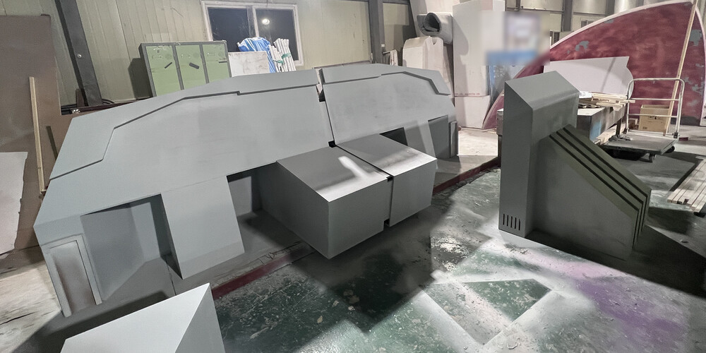재단이 완료된 잠수함 하우징 조형물은 도면에 따라 결합 작업을 진행하였습니다. 대형 잠수함 조형물의 결합은 목공용 본드와 타카를 사용하였으며, 내부에는 안정적으로 사용할 수 있는 보강 구조를 추가하여 전시 기간 동안 안정적으로 사용할 수 있도록 제작해 주었습니다. 결합이 완료된 전시 형물은 모서리, 표면 등 설치 이후 안전사고가 발생하지 않도록 연마 작업을 진행해 주었습니다.