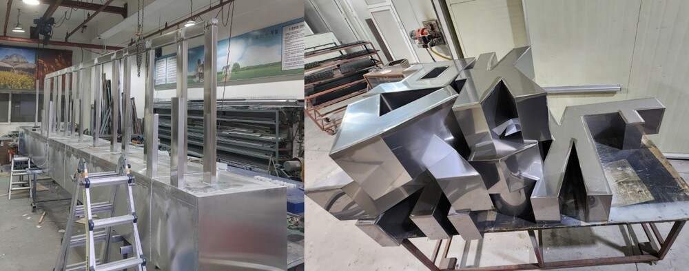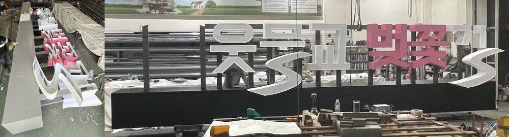 디자인 시안이 최종 확정된 이후에는 조명 기능이 포함된 문자 조형물의 본 제작이 본격적으로 진행되었습니다. 이번에 납품된 제주도 설치물은 스테인리스를 주 재료로 사용하여 부식과 녹에 강하고 기후 변화가 큰 외부 환경에서도 견고함을 유지할 수 있도록 설계되었습니다. 기본 구조는 절곡과 용접 과정을 통해 형상을 구현하였고 접합 부위에서 생길 수 있는 미세한 단차나 표면의 잔기스는 정밀 연마 작업을 통해 매끄럽게 처리하였습니다.