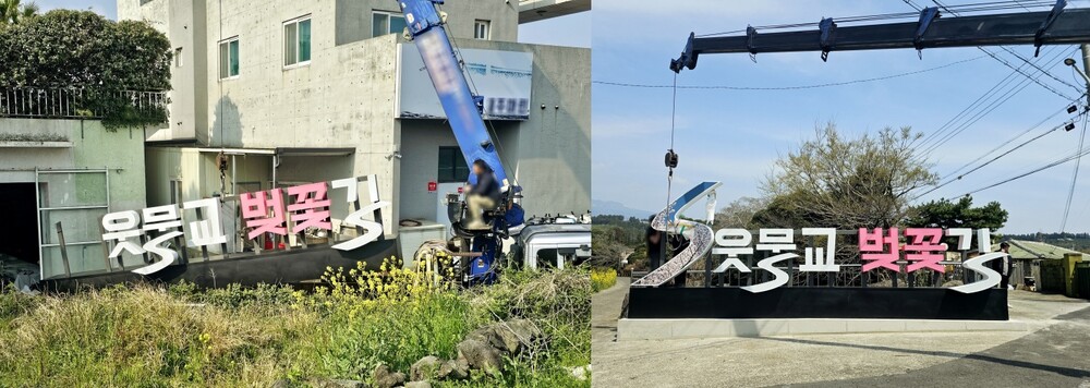 설치 작업까지 마무리된 조형물은 클라이언트의 최종 검수 과정을 끝으로 조명형 웃물교 벚꽃길 글자 입구 안내 금속 조형물 프로젝트를 마무리해 주었습니다.