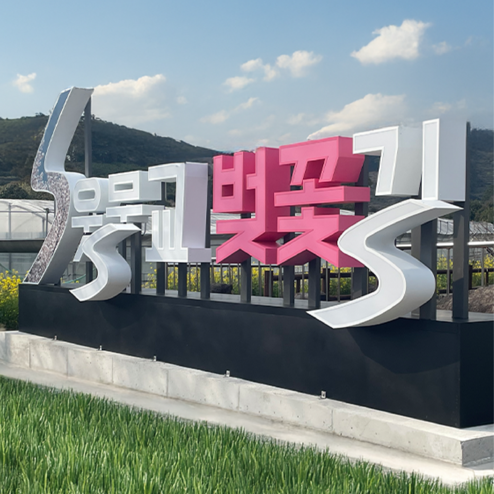 문자 형태를 활용한 구조물은 특정 장소의 메시지를 직관적이고 시각적으로 인지시키는 데 효과적이기 때문에 공공 공간이나 관광 명소 등에서 자주 선택되는 조형물 형식 중 하나입니다. 이번 글자 조형물에서도 이러한 특성을 반영하여 밤에도 공간의 매력을 살릴 수 있도록 내부에 조명을 더해 야간 경관을 한층 풍성하게 연출할 수 있도록 계획하였습니다. 금속 조형물이 설치되는 하부 구조는 넓고 견고하게 제작되어 전체 무게를 안정적으로 지지할 수 있도록 설계되었습니다.